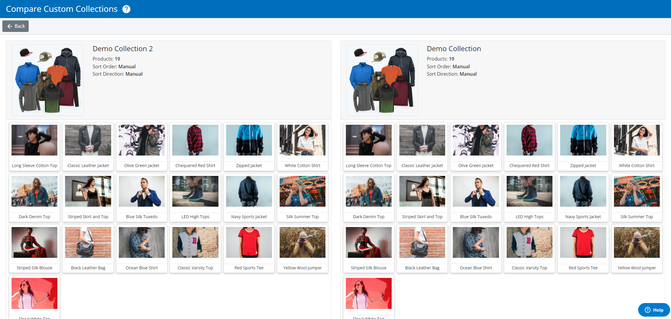 4. Once you've selected two custom collections, click the **Compare** button. This will take you to a page where you can drag and drop products between the two collections you've selected.\ <img src="https://148321946-files.gitbook.io/~/files/v0/b/gitbook-x-prod.appspot.com/o/spaces%2FToy9LI0ouoCYva18VDIu%2Fuploads%2FQsqGXboZSlomHHLg0oSC%2Fimage.png?alt=media&#x26;token=80f73e49-67d8-42a1-bc35-cbf684dab684" alt="" data-size="original">